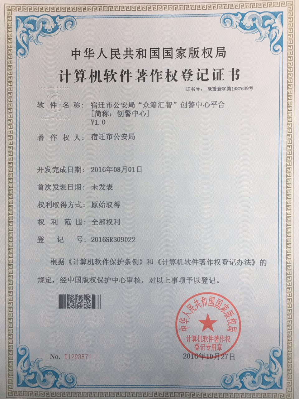 近日,由我司同宿遷市公安局自主研發(fā)的宿遷市公安局“眾籌匯智”創(chuàng)警中心平臺成功獲得軟件著作權登記證書。 市局研發(fā)的創(chuàng)警中心平臺為國內首次發(fā)布,系市局首個自主開發(fā)、擁有自主版權的計算機軟件。此次軟件著作權的取得,對外展示了我...