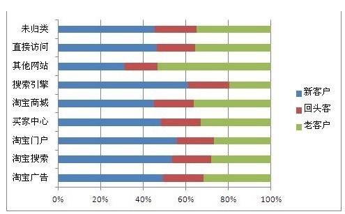 從上述圖表中,我們可以看到賣家一周內(nèi)的新客戶、回頭客、老客戶都是從不同的來源進(jìn)入網(wǎng)店的?;蛟S因搜索排名、口碑、品牌、商品展示等因素影響了消費(fèi)者的首次購買行為。細(xì)心的朋友會(huì)發(fā)現(xiàn),在上表中,回頭客、老客戶是店鋪流量的主力軍,但他們的來源又各不一樣,從其他網(wǎng)站、商城、直接訪問、買家中心來的老顧客占得較多,而且質(zhì)量也比較高。